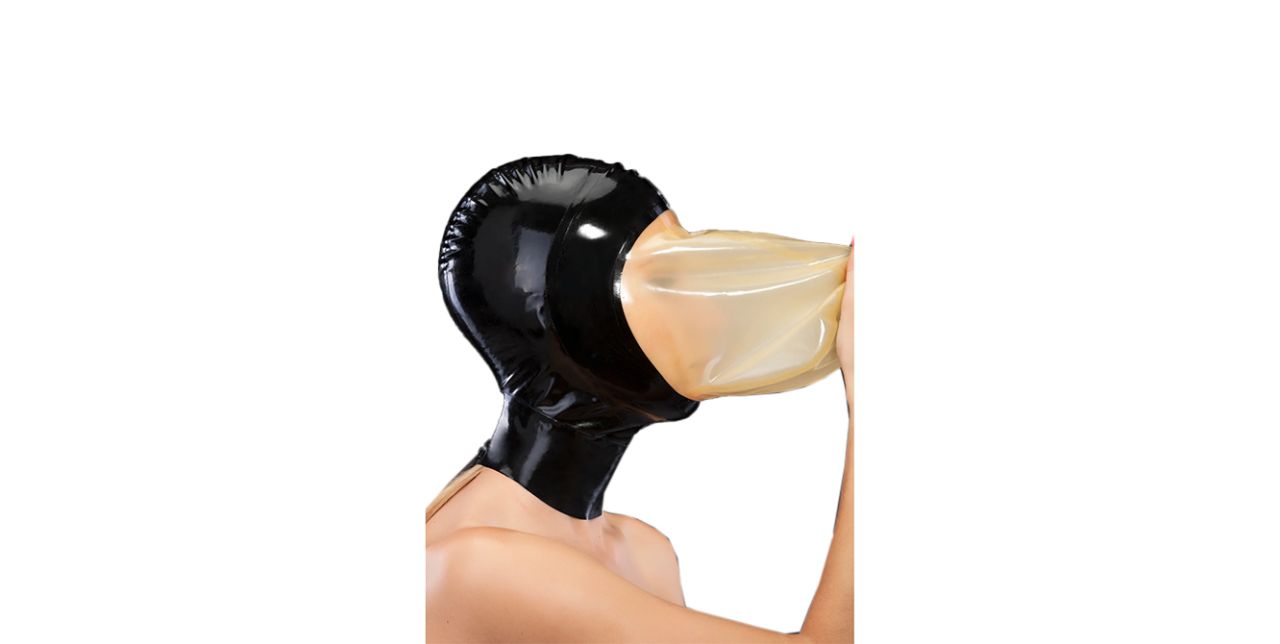 Eine schwarze Latex-Maske mit vergrößertem vorderem Bereich aus transparentem Latex und einem kleinen Loch zum Atmen. Beim schnellen Atmen kann es schwierig werden, durch die Maske zu atmen, daher ist es wichtig, die Atmung zu kontrollieren. Diese Maske wird zu einem perfekten Accessoire für Spiele, bei denen die Atmung eine Rolle spielt. Der Reißverschluss auf der Rückseite macht das Anziehen der Maske einfach und bequem.
