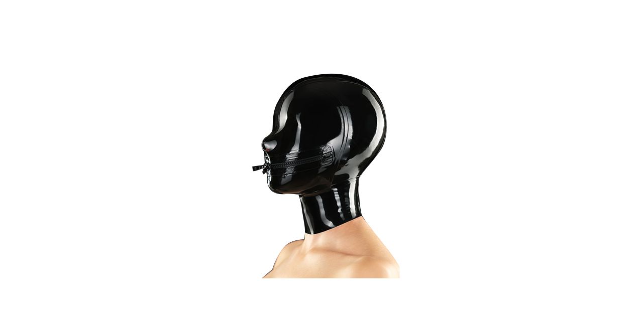 Latexmaske mit Mund-Reißverschluss, zwei Schiebern und Nasenlöchern, hergestellt aus hochwertigem Latex. Rückseitiger Reißverschluss mit einer Latex-Schicht darunter.